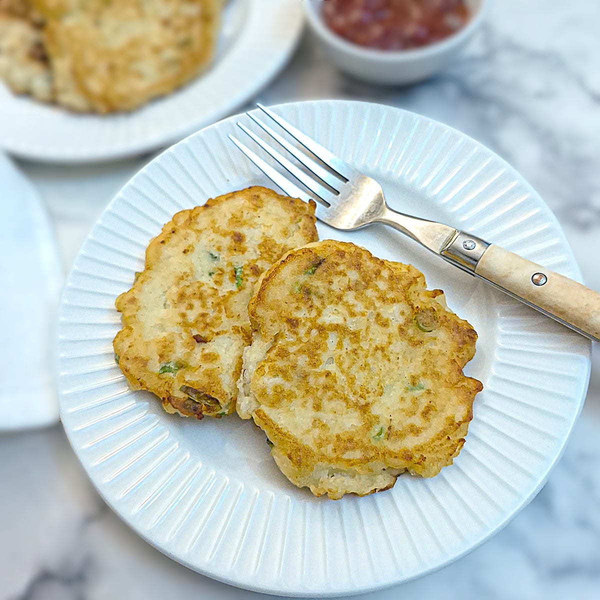 - Flip the potato cakes with a spatula, then fry the other side for 3 to 4 minutes, and drain on a piece of paper towel. Serve hot with your favourite dipping sauce. See the post for other serving suggestions and variations.